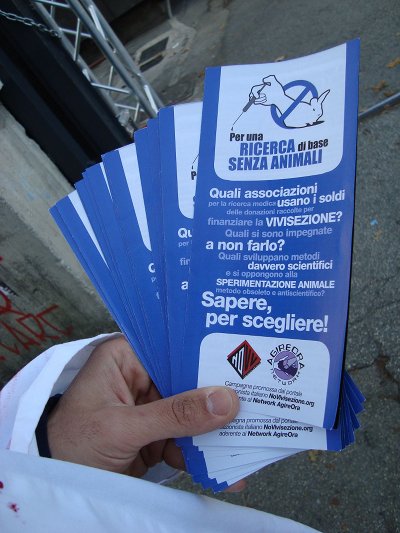 Dalle 15 alle 19 sono stati distribuiti più di mille volantini informativi, che mettevano in evidenza i dati relativi alle vittime della vivisezione (900 mila animali usati ogni anno in Italia, 12/14 Milioni in Europa), ai metodi con cui questi animali vengono torturati (molte immagini, portate anche addosso dai manifestanti, erano evidenti), ed alle varie discipline scientifiche implicate in essa (Tossicologia, Psicologia, Chirurgia, Fisiologia, Patologia Genetica, Farmacologia le principali).