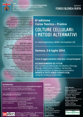 Il Laboratorio di Colture Cellulari LARF (Laboratorio Analisi Ricerca di Fisiopatologia) dell'Università di Genova organizza il 3 e 4 luglio 2014 la sesta edizione del Corso teorico-pratico intitolato "Colture cellulari: i metodi alternativi", con crediti ECM (17 crediti), indirizzato a Medici, Biologi, Chimici, Farmacisti e Tecnici sanitari di laboratorio medico, ma aperto anche agli studenti (senza assegnazione di crediti).