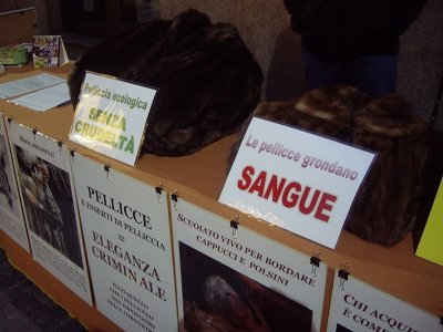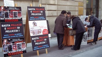 Per questa iniziativa, per attirare gente al tavolo a firmare la petizione popolare sull'abolizione degli allevamenti di animali da pelliccia in Italia, promossa da VisoniLiberi.org, dovevamo essere abbastanza visibili.