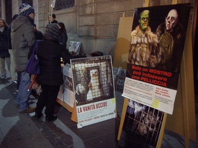 Per rendere il messaggio più chiaro, c'erano anche alcuni cavallettoni con altri pannelli questa volta descrittivi, che mostravano che anche le bordature in pelo dei cappucci o dei polsi dei giubbotti, spesso sono di pelliccia vera, anche quelli animali ammazzati, che è meglio quindi evitare di comprare.