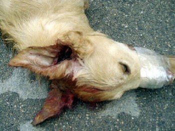 Il cane, una giovane femmina, è stato assassinato con un cuneo di legno introdotto a forza nelle fauci che evidentemente ha sfondato all'animale il cranio dall'interno. Il cadavere presentava parecchio sangue proveniente dalle orecchie. Il povero cane è stato inoltre privato dei suoi ultimi respiri con alcuni giri di nastro adesivo e lasciato in strada ad agonizzare.