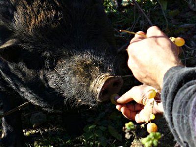 E mi è venuta subito in mente la pubblicità del prosciutto, quelle fette rosa delicato, che ci si infila in bocca senza pensare cosa si sta facendo, cosa c'è dietro quel rosa, quanta sofferenza... divorare crudeltà, potrebbe essere la coscia di quella creatura che mangia l'uva dalla mano, che non è diversa dalla coscia di quel cane che non avreste mai il coraggio di affettare. Guardate tutte le foto, spero che riusciate ad immaginare l'armonia, e nel frattempo oltre ad essere felici, per quelle pochissime creature che non verranno uccise... è stata LIBERATA UNA COPPIA DI CANI! Evento straordinario, ma in un contesto del genere sembra normale...