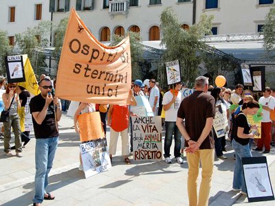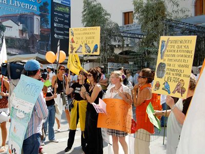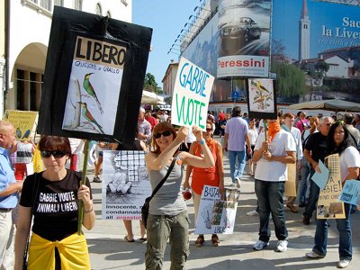 Domenica 16 agosto, alle nove del mattino, una trentina di attivisti animalisti friulani e veneti si sono dati appuntamento in Piazza del Popolo a Sacile per manifestare contro la tristemente nota Sagra dei Osei. Piazza Del Popolo rappresenta il cuore pulsante di questa manifestazione, incentrata sull'esposizione e sul mercato di uccelli canori, che ha raggiunto la 736esima edizione: figura perciò tra le più antiche sagre popolari d’Italia. Con il suo concorso canoro e con la presenza di migliaia di uccelli, rappresenta (purtroppo) la più importante manifestazione avicola europea.