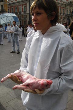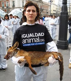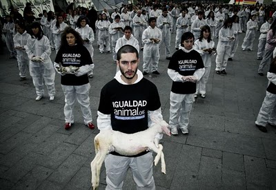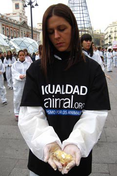 In coincidenza con la Giornata Internazionale per i Diritti Umani, Uguaglianza Animale ha celebrato la Giornata Internazionale per i Diritti degli Animali, come sta facendo da diversi anni, rivendicando l'estensione dello stesso rispetto che dovremmo avere per l'essere umano al resto degli altri animali. Più di un centinaio di attivisti di Uguaglianza Animale provenienti da diverse zone della Spagna e dall'estero, ha tenuto nelle proprie mani i corpi morti di agnelli, galline, visoni, maiali, polli, pesci, gatti, volpi e conigli, che sono stati prelevati già morti da diversi allevamenti di animali.